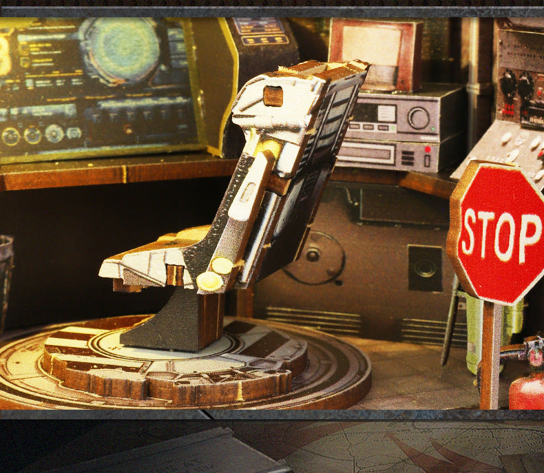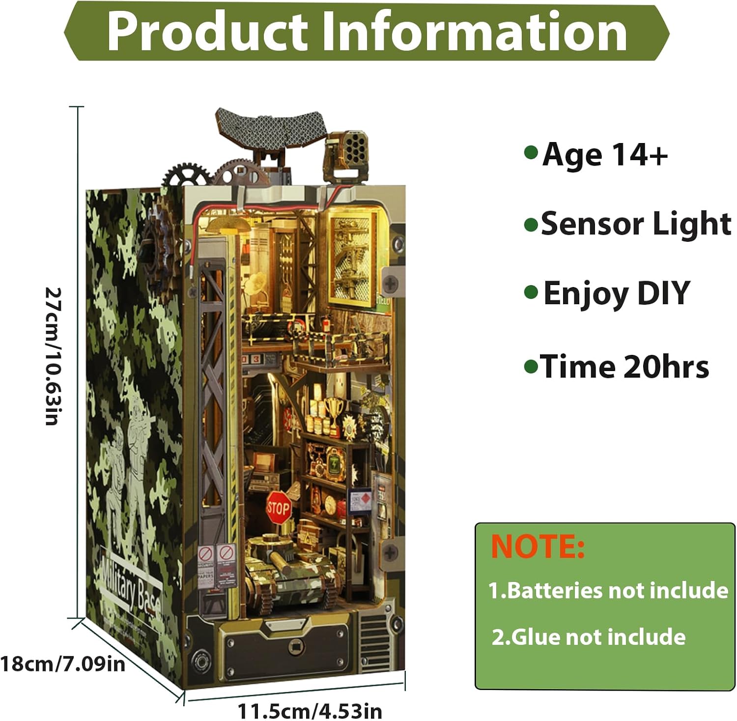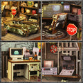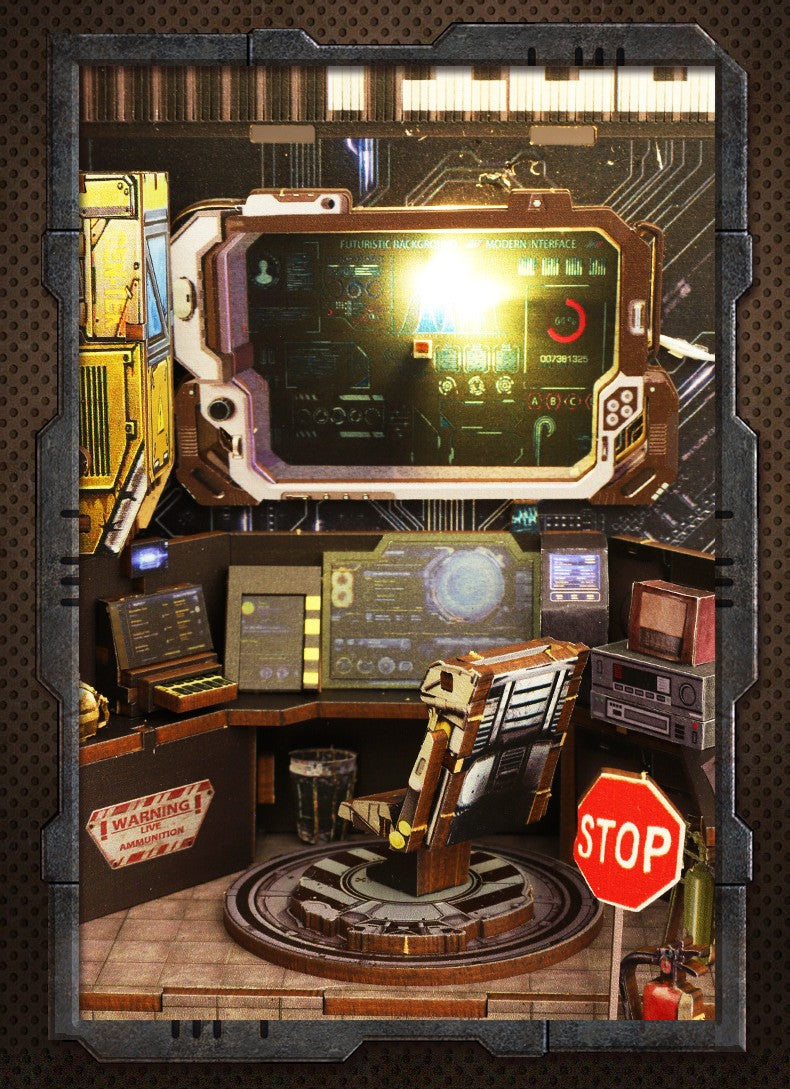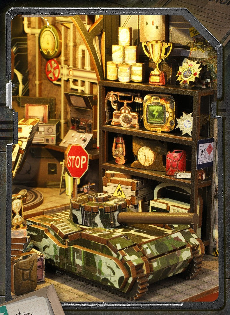 Recreate a detailed miniature military operations room, featuring intricate computers, radar screens, and mechanical equipment. The LED lighting system enhances the atmosphere, bringing a warm glow that highlights every futuristic element—from the armored tanks to the control panels. A must-have for fans of DIY book nook kits and military-themed collectibles.