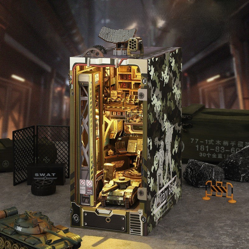Enter a world of strategy, technology, and precision with the DIY Military Base Book Nook Kit. This futuristic miniature scene captures the inside of a secret command center—complete with control panels, tactical screens, and armored vehicles. Ideal for model enthusiasts and book nook collectors, it transforms your shelf into a high-tech military hub glowing with LED lights and adventure.