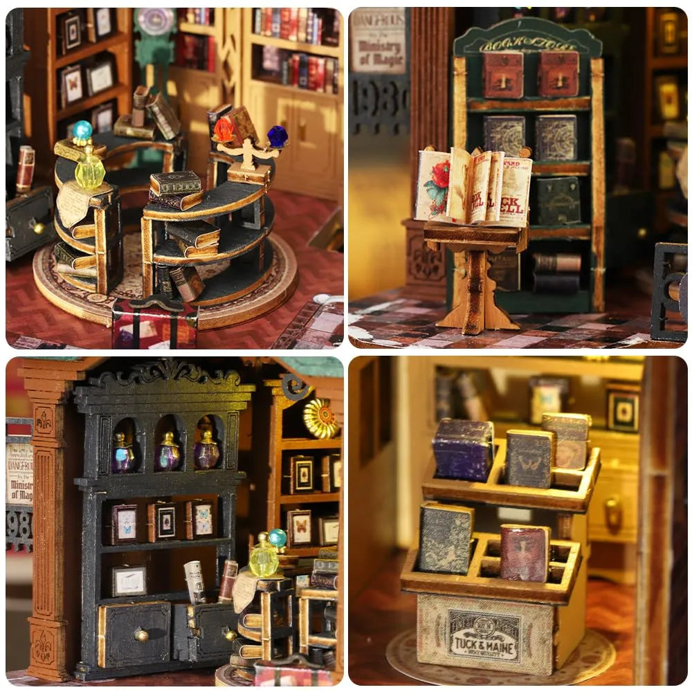 This book nook puzzle is a form of hobby crafting that culminates in a spectacular piece of handmade décor. The warm glow of the built-in LED lights illuminates every intricate detail, transforming your bookshelf into a cozy escape and an engaging focal point. It’s an ideal gift for readers who are captivated by the charm of vintage miniature architecture and the magic found in stories.