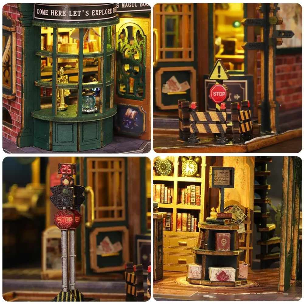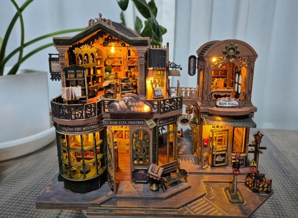 Imagine creating a tiny, bustling city block right on your bookshelf. Our DIY Twilight Miniature House Book Nook Kit offers a uniquely rewarding experience, bringing to life a detailed miniature shop scene that’s full of character. This isn’t just a book nook kit; it’s an invitation to build your own book nook, a delightful mini bookshelf accessory that captures the essence of a lively, enchanted urban corner. Every piece, from the winding staircase to the ornate lampposts, contributes to a miniature scene that feels both grand and intimate.