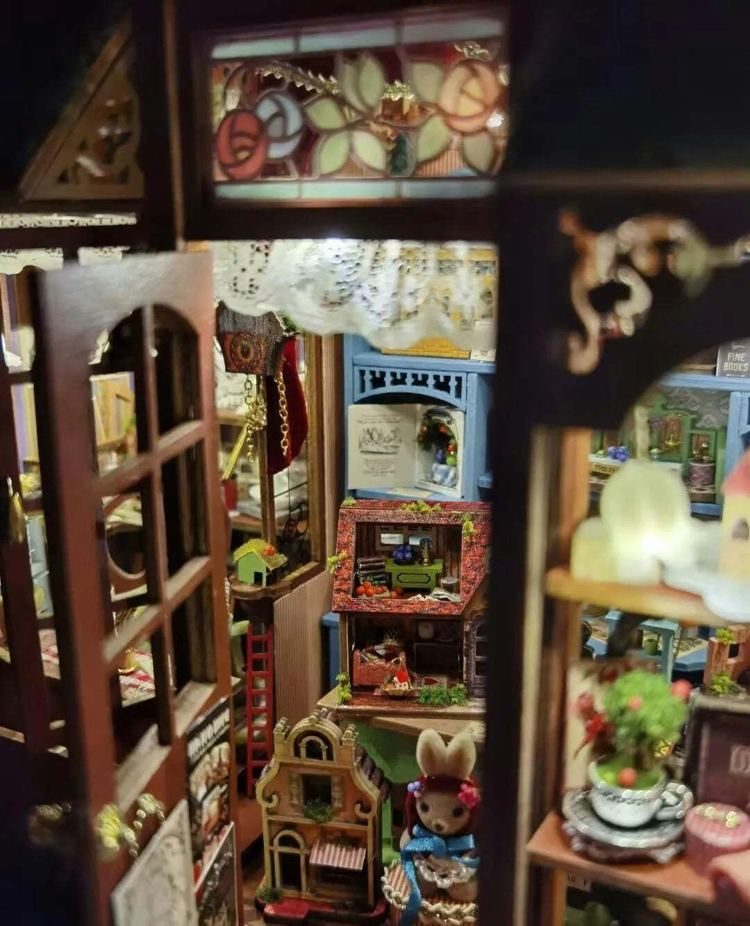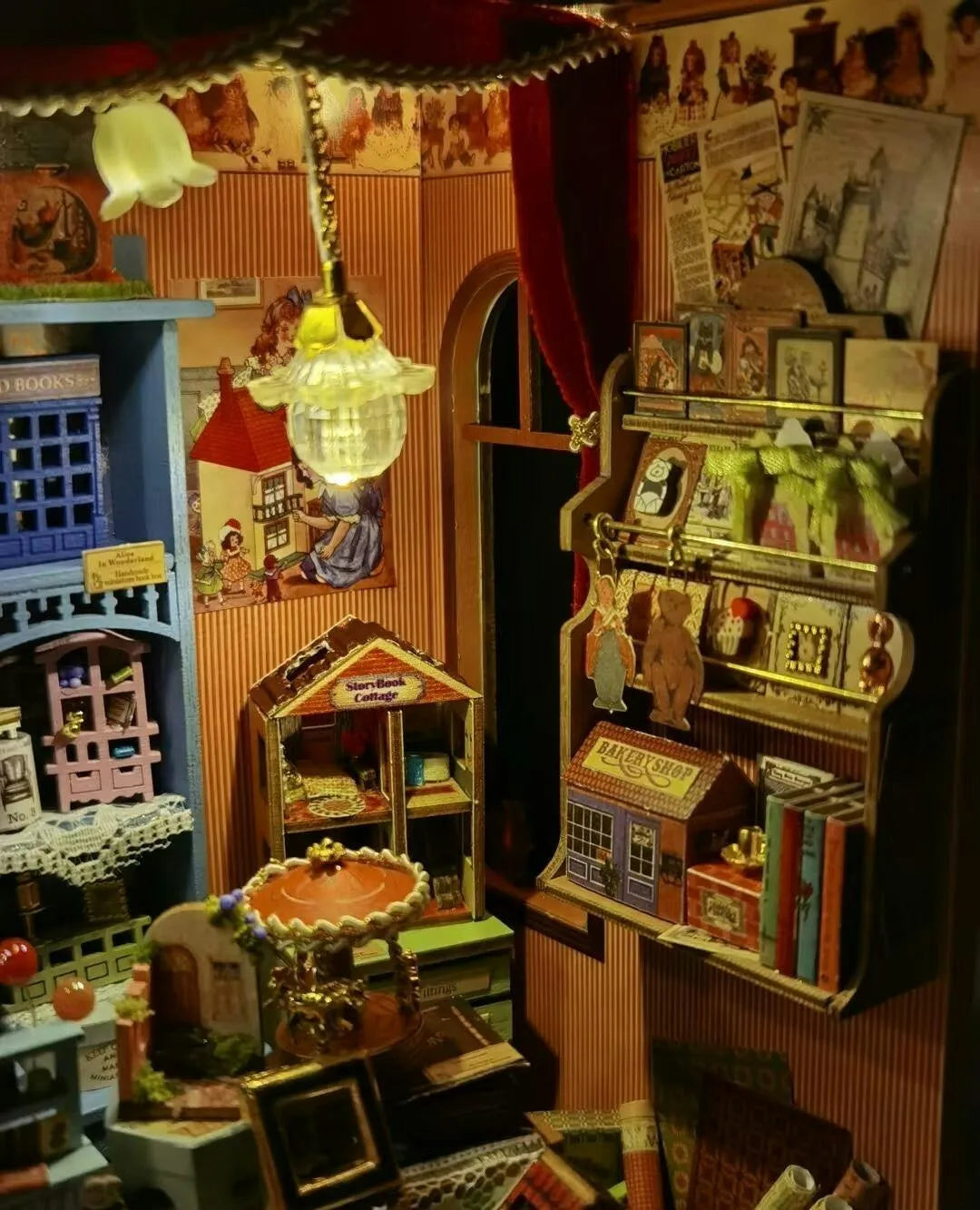 Once finished, this book nook transforms your ordinary bookshelf into an extraordinary, captivating focal point. The soft, warm LED lights nestled within the shop windows illuminate tiny, charming details, creating a beautiful miniature scene that looks like it's been pulled directly from a fairy tale. This piece of handmade décor is a perfect addition to any reading corner décor, adding an element of fantasy and warmth.