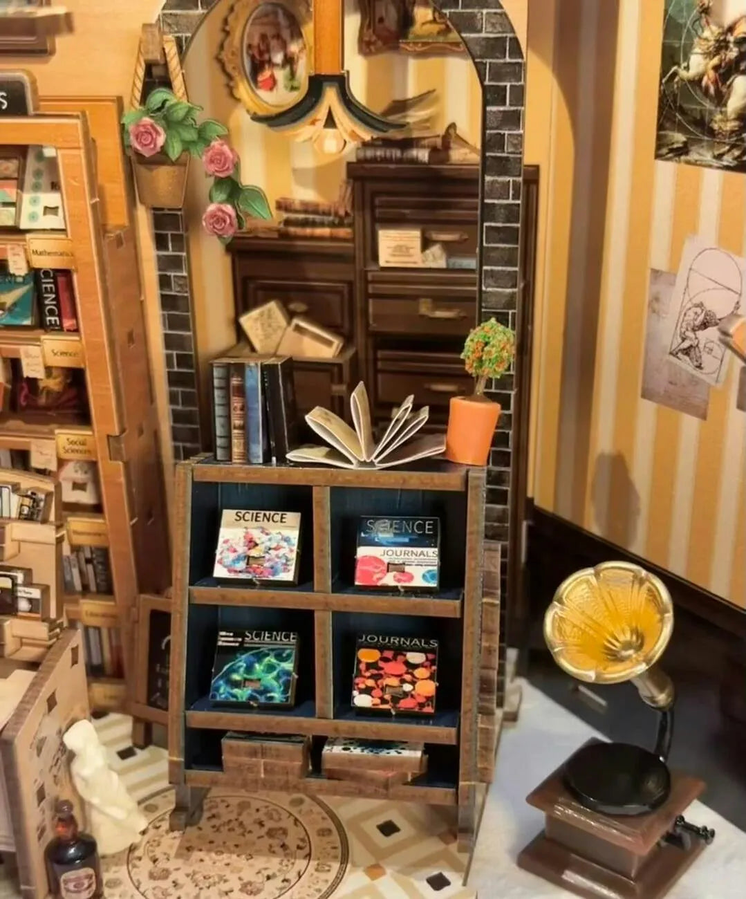 This miniature shop is a testament to the art of storytelling on a small scale. It transcends mere decoration, becoming a focal point that sparks conversation and inspires dreams. Whether you’re looking for a striking vintage miniature to complete your aesthetic or a unique city miniature to bring urban charm to your shelves, the Scholar Bookstore Book Nook promises to be a treasured addition to your home.