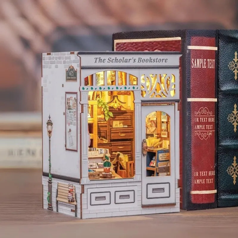 The Scholar Bookstore book nook is a masterfully designed piece that captures the rich, scholarly atmosphere of a beloved library. We've paid careful attention to every detail, from the ornate facade to the tiny, welcoming cat tucked among the shelves. This library book nook kit beautifully captures the essence of a place where great minds meet and new ideas are born. It evokes the enchanting feeling of discovering a hidden gem, much like a Harry Potter book nook or a whimsical journey through a Booknook and Wonderland.