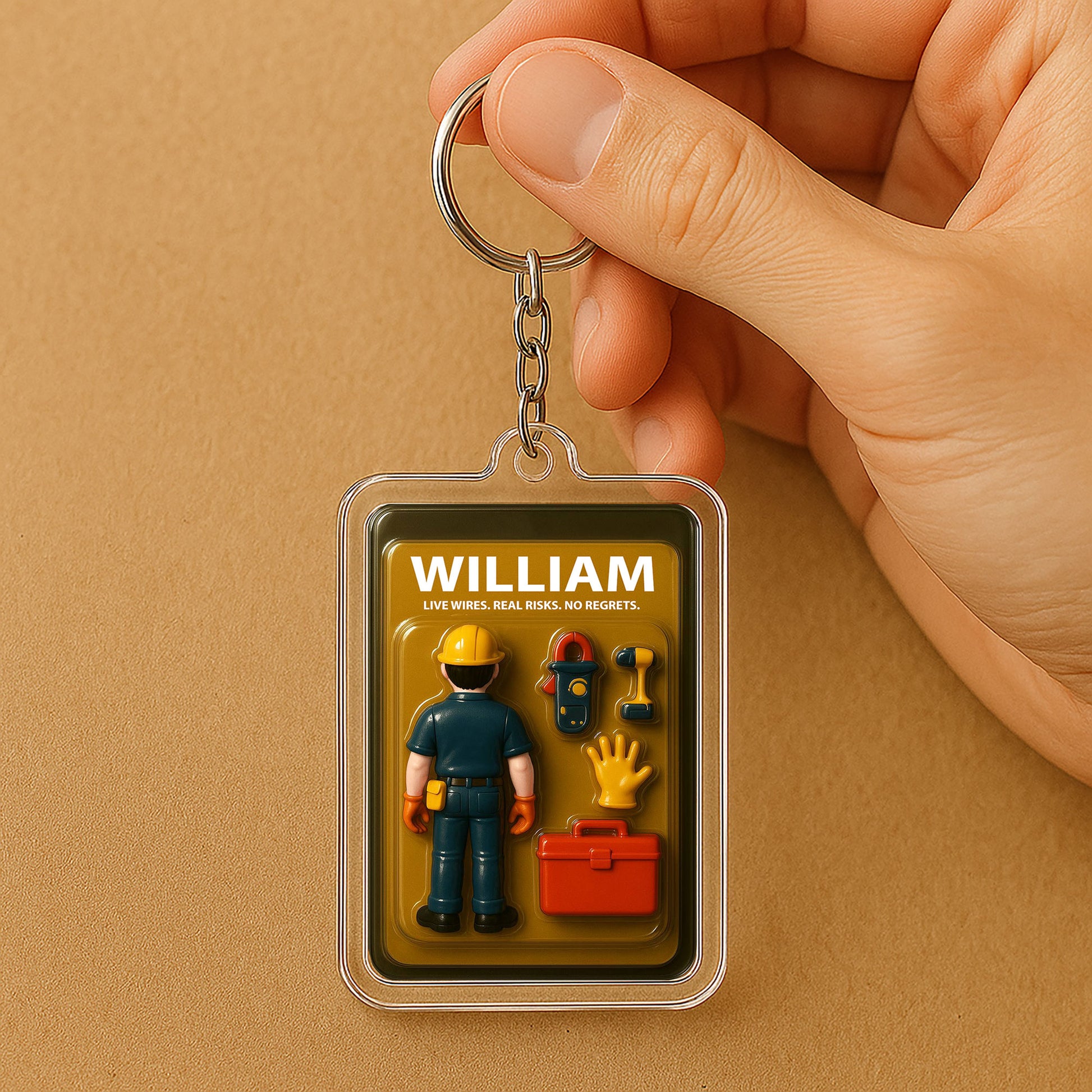 3D Style "Live Wires" Design: Features a distinctive, dimensional design with a playful "Live Wires" theme, often incorporating electrician symbols like lightning bolts, tools, or wiring diagrams. Benefit: Offers a visually appealing and modern keychain that stands out, humorously and proudly representing their skilled trade.