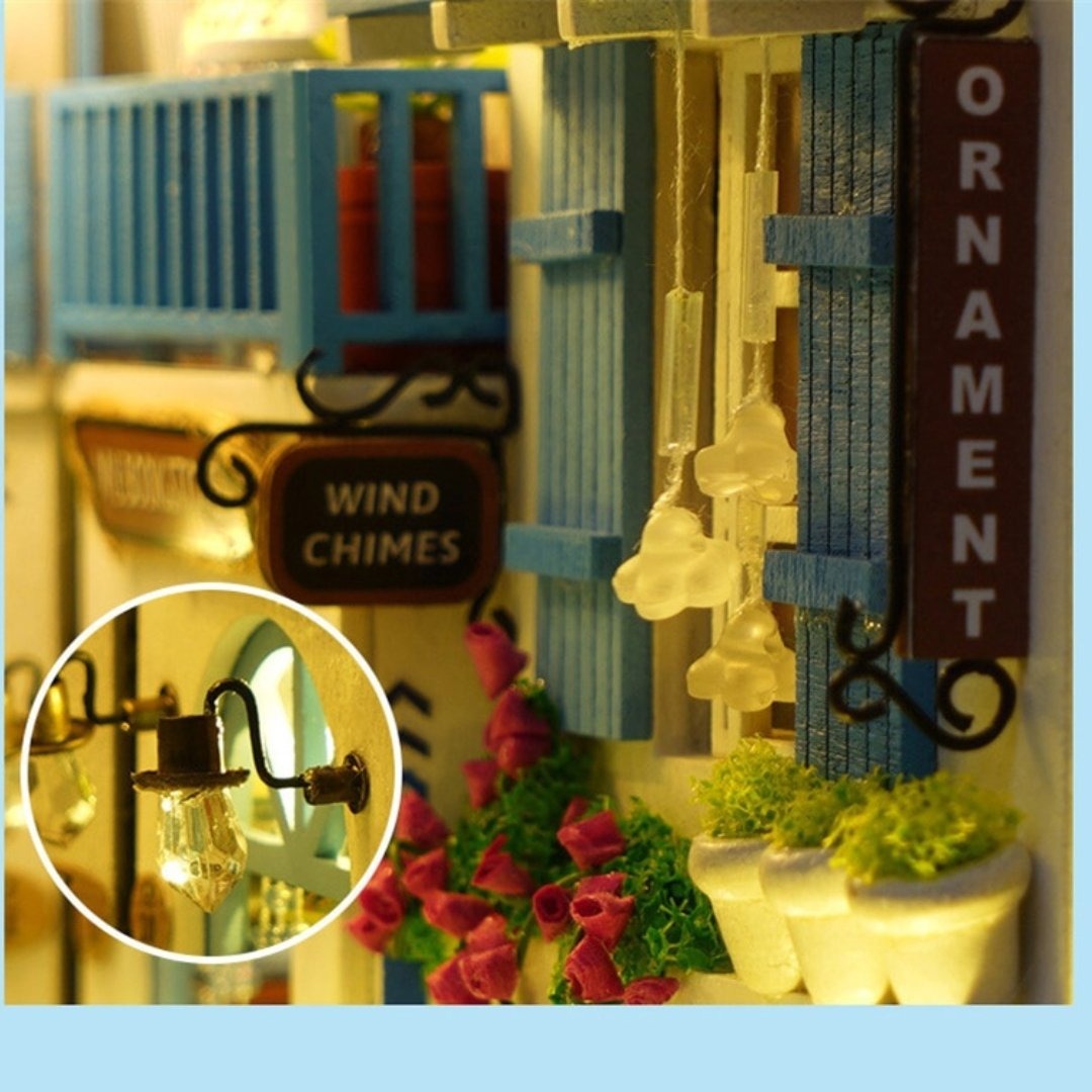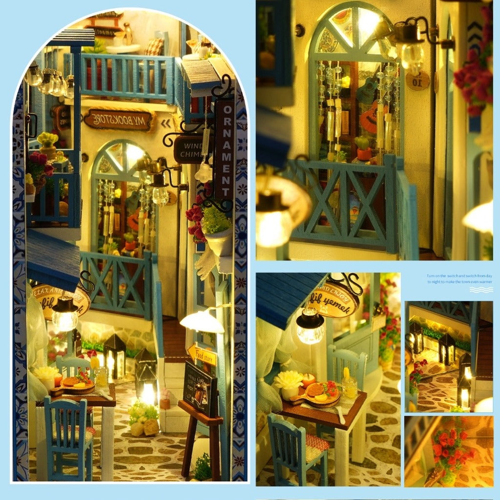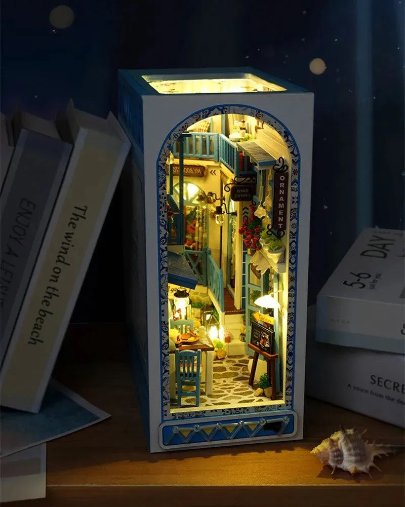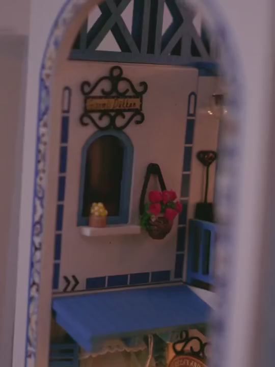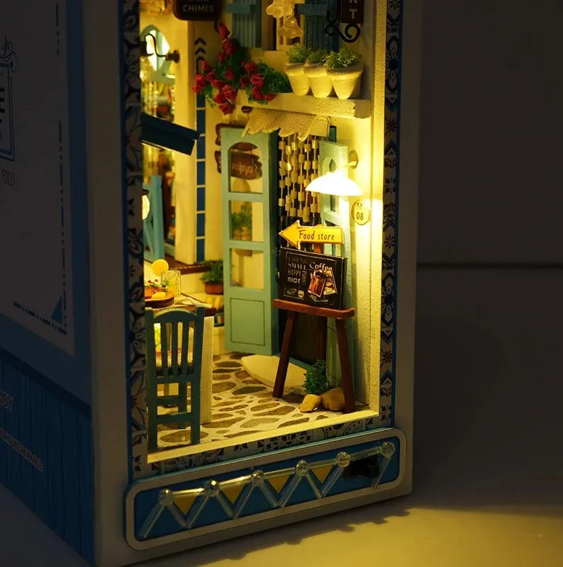 Bring the calm charm of the Mediterranean coast to your bookshelf with the Sea Breeze DIY Book Nook Kit. This exquisite miniature scene captures a sunlit seaside café and cobblestone street, complete with balconies, flowers, and glowing lanterns. Designed to transport you to a peaceful coastal village, it’s a beautiful blend of craftsmanship, relaxation, and creativity — perfect for any home or reading nook.